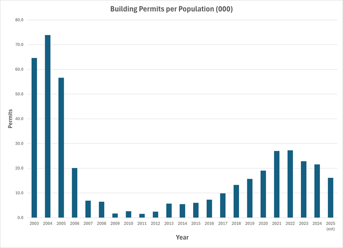 But the chart ignores the fact that the county’s population has expanded by 128% since 2003. A more accurate depiction combines permits issued with population growth. The following chart does just that, showing the number of permits issued per 1,000 county residents. The result is a clearer picture of the development of new residential construction. Clearly, our infrastructure “crisis” cannot be blamed on growth.