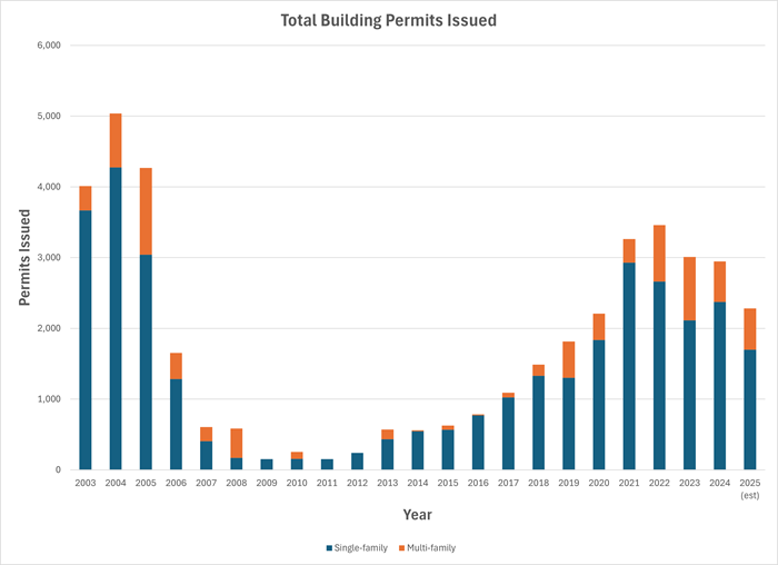 The chart below shows the number of residential building permits issued by all jurisdictions in Flagler County between 2003 and 2025. The single-family category includes single-family homes with duplexes counted as two units each. Multi-family includes townhomes, apartments, and condominiums.